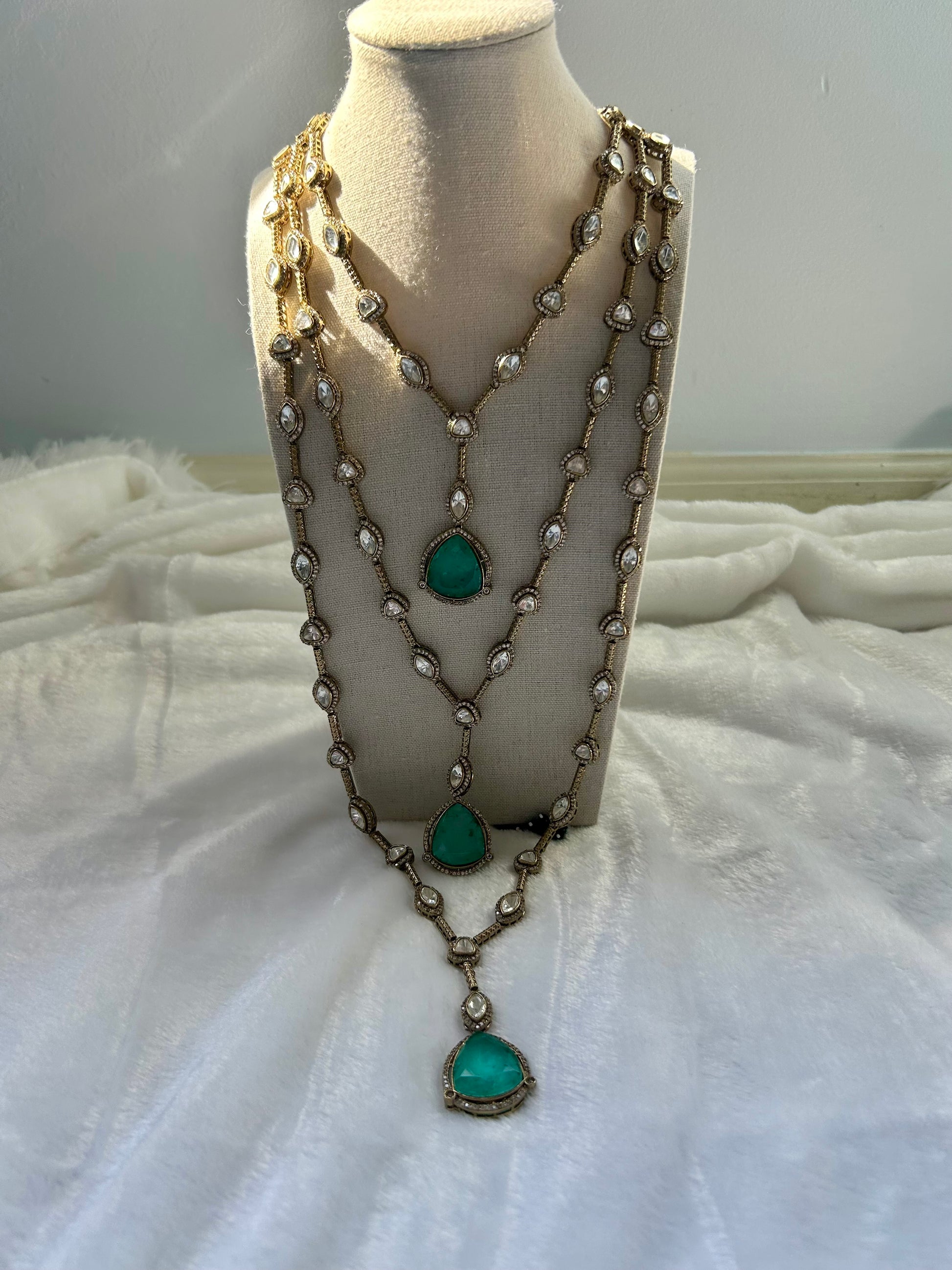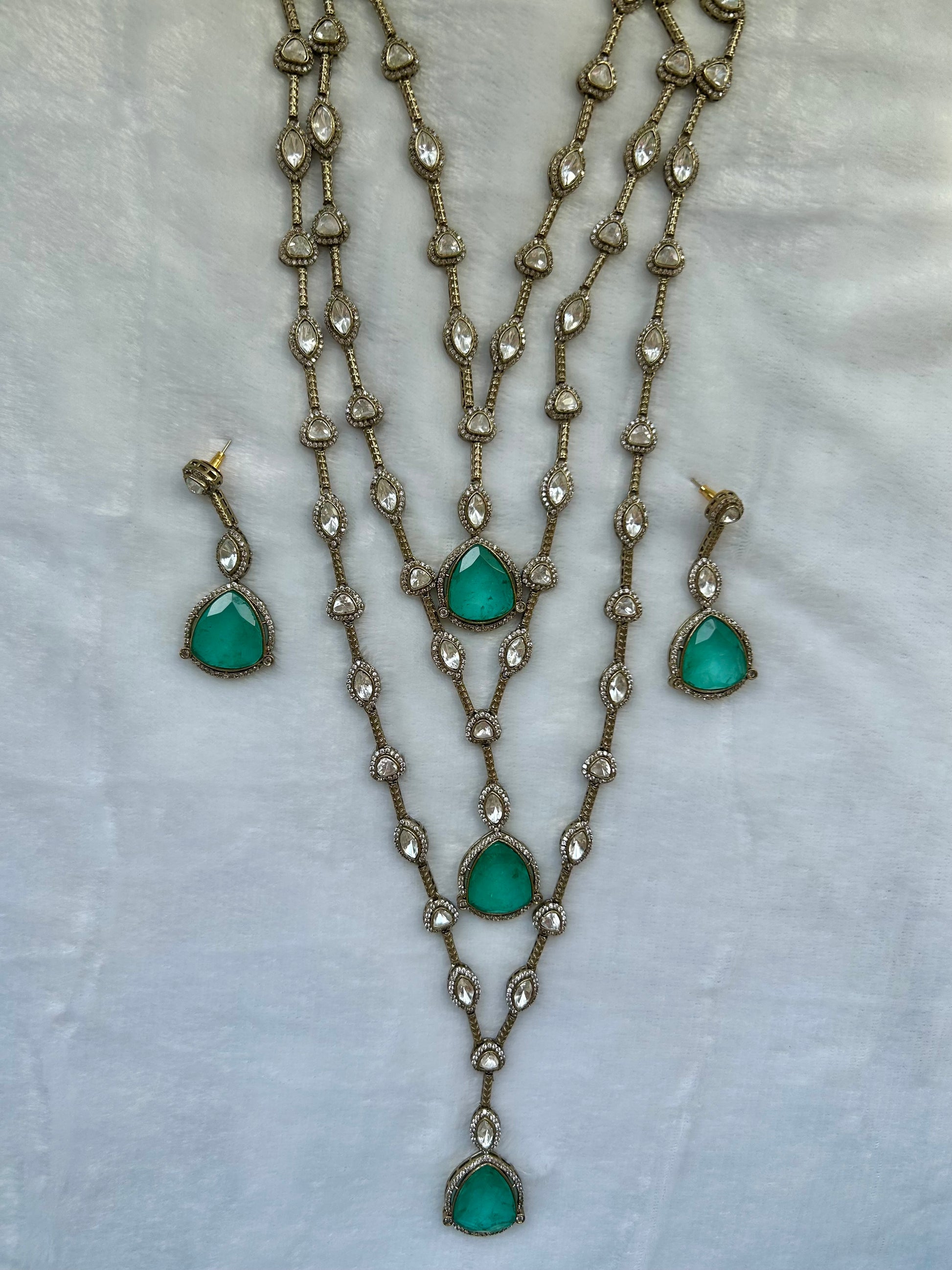 3 Layered Sea Green Doublet & Moissanite Necklace Set